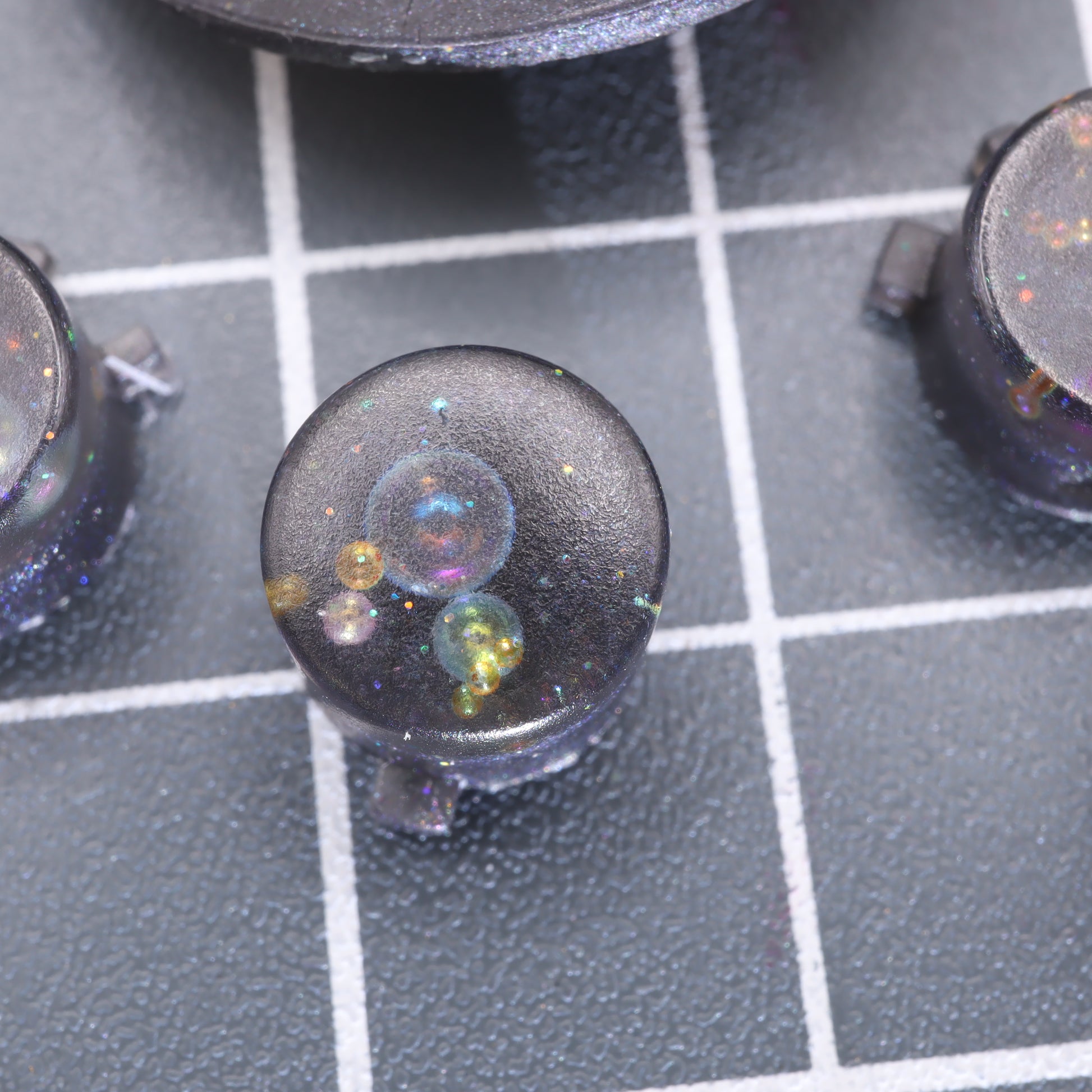 The process -A clear or colored resin cap is poured and partially cured. Then a special effects layer is added, partially cured and then the buttons are backfilled with colored or clear resin. Molds are then cured for 24 hours before the buttons are removed. All residue and any flashing are removed by hand and inspected for quality.